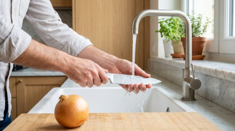 L’acier froid crée, au contact de l’oignon, une condensation immédiate : les huiles essentielles et gaz irritants se retrouvent emprisonnés sur la lame humide froide, au lieu de se disperser dans l’air ambiant. Pour une quantité importante d’oignons, il est judicieux de rincer régulièrement la lame sous l’eau très froide entre chaque bulbe, garantissant ainsi une protection efficace sur toute la durée de la préparation.