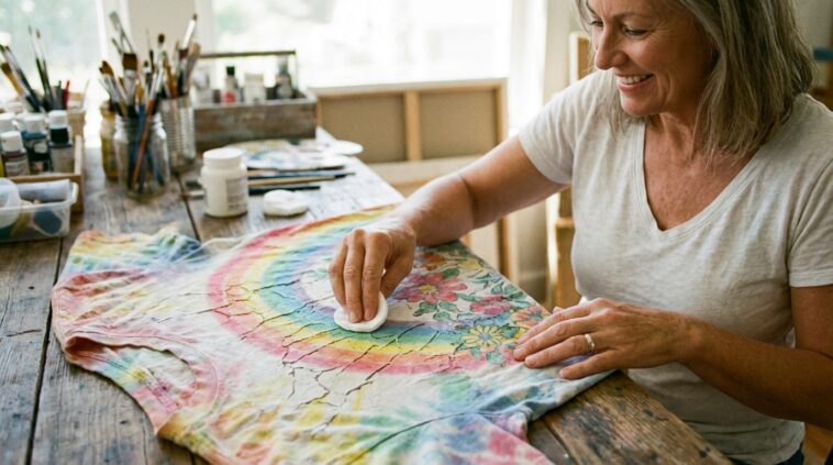 La préparation conditionne le résultat. La zone du motif doit être propre, et le tissu du t-shirt idéalement bien tendu pour éviter les plis qui marqueraient le vinyle au repassage. Protéger l’envers aide aussi à garder une surface stable pendant la manipulation. Ensuite vient l’étape décisive : tamponner délicatement l’acétone sur le motif craquelé avec un coton. Le mot clé est “délicatement” : il s’agit de petites touches, sans frotter, pour doser et observer. Le bon signe est un vinyle qui semble s’assouplir, sans se délaver ni se transférer. Ici, le rythme et le dosage font toute la différence.