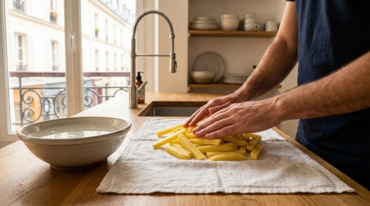 Après avoir offert ce bain salvateur à vos légumes, une autre mission de haute importance vous attend. Maniez un grand torchon de coton parfaitement propre avec la plus grande fermeté. Déposez-y les frites fraîchement égouttées. L’eau résiduelle est l’ennemi juré du croustillant ; si vous enfournez des légumes mouillés, ils vont simplement bouillir dans leur jus. Le four se transformera en hammam au lieu de rôtir efficacement la matière.